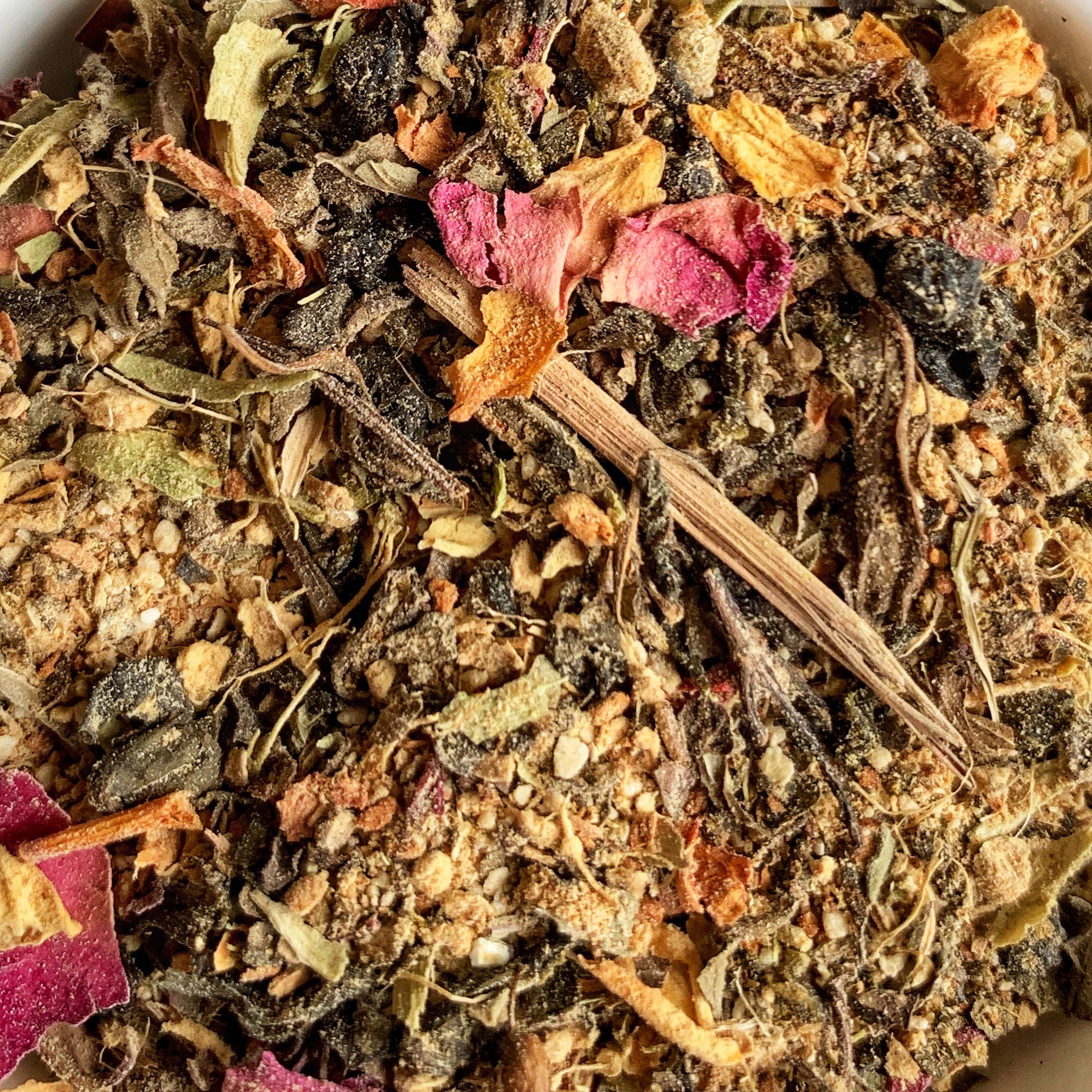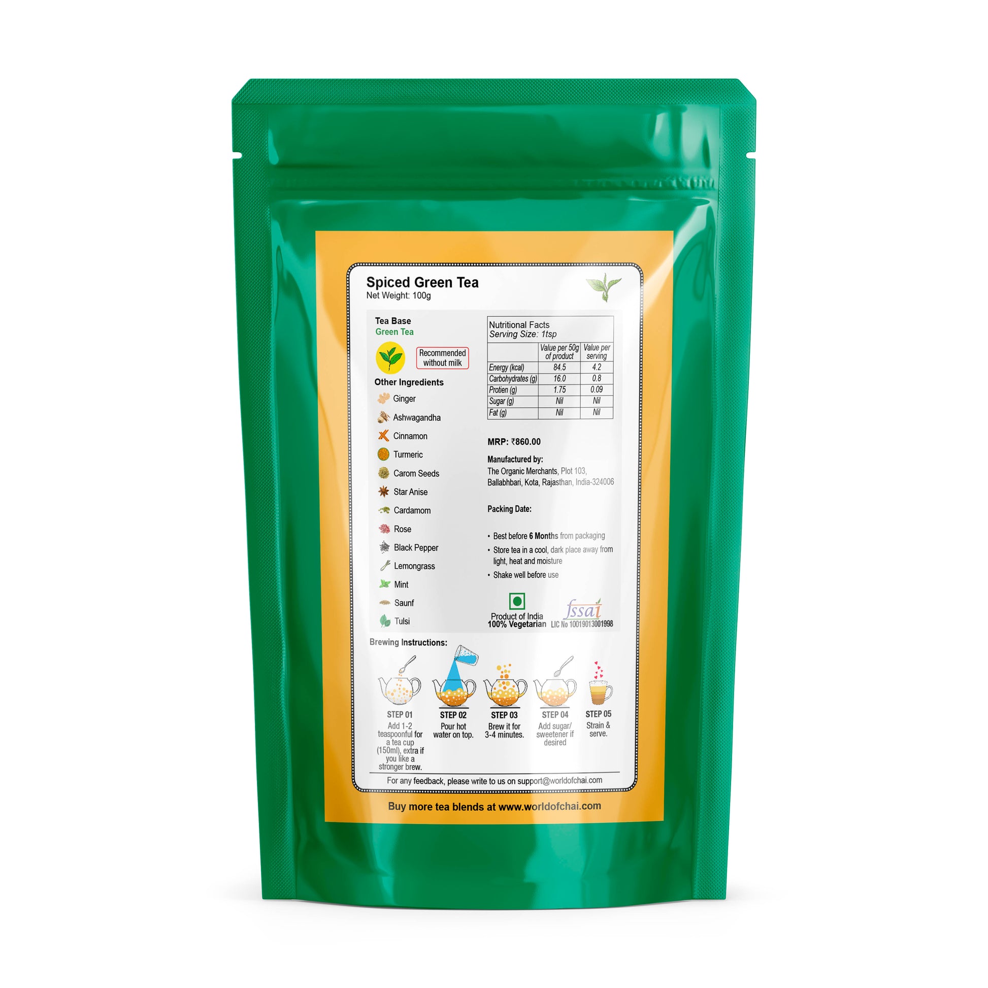 Ingredients: Green Leaf Tea with Adrak(Ginger), Haldi (Turmeric), Ajwain(Bishops weed), Ashwagandha, Chakra Phool(Star Anise), Dalchini(Cinnamon), Elaichi(Cardamom), Gulab(Rose), Kalimirch(Black Pepper), Lemongrass, Pudhina(Peppermint), Saunf(Fennel) and Tulsi